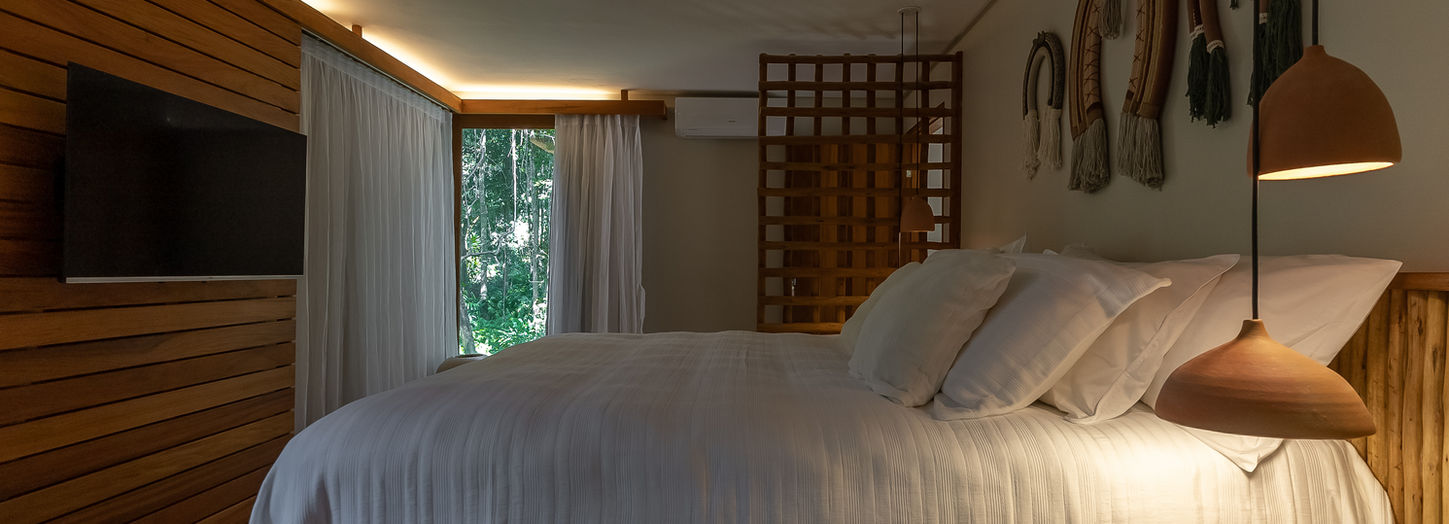 Rodeada por árvores e com vista deslumbrante para a mata, a casa com 3 suítes é um convite à serenidade. O som do mar ao fundo completa a atmosfera de tranquilidade. Cada suíte é equipada com cama king size, ar-condicionado, TV, wi-fi e amenities L’Occitane — detalhes pensados para proporcionar uma estadia inesquecível, com charme e conforto.
